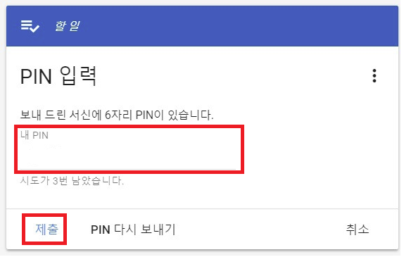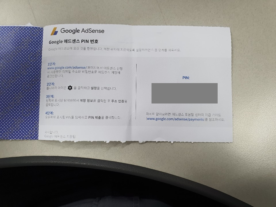 우측 중앙에 있는 파란색 글씨의 PIN 번호를 구글 애드센스 싸이트의 제출 화면에 등록하면 끝이 납니다