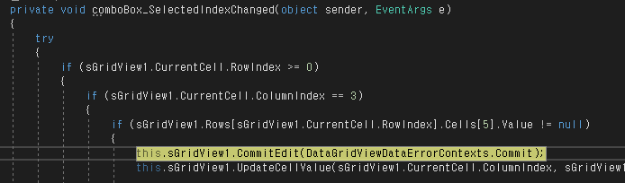 그리고 EditingControlShowing() 함수가 동작했을때 정의한 콤보박스에 SelectdIndexChanged 함수가 동작하게 합니다