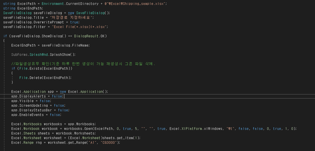 위의 소스 코드 영역은 엑셀 파일(템플릿)을 불러와 첫번째 시트 중 A1부터 CG3000까지를 영역 설정을 지정하는