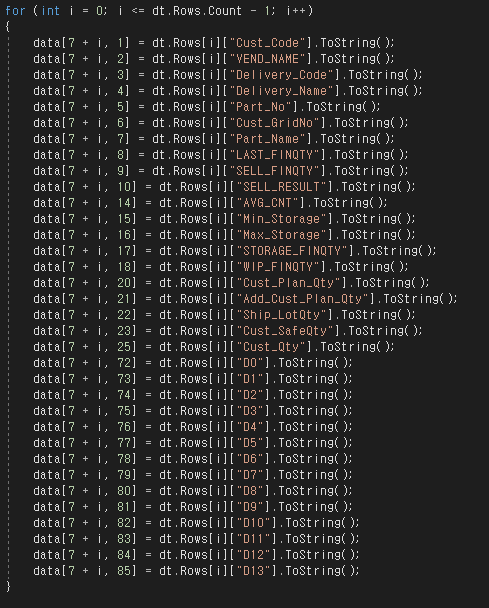 data[7 + i, 83] = dt.Rows[i]["D11"].ToString();