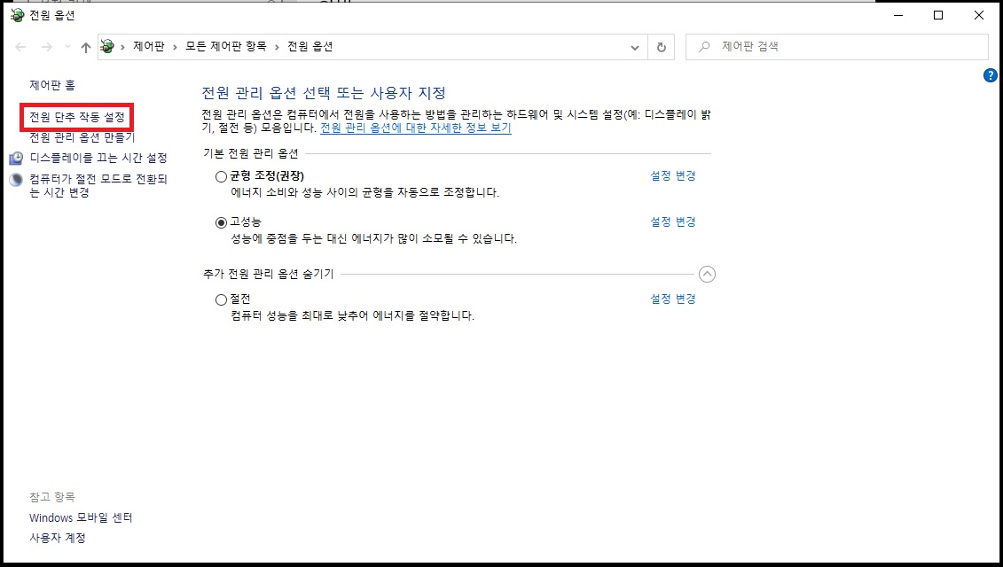 - 추가 전원 설정 메뉴에서 좌측의 전원 단추 작동 설정 항목 클릭