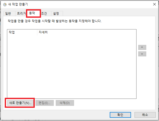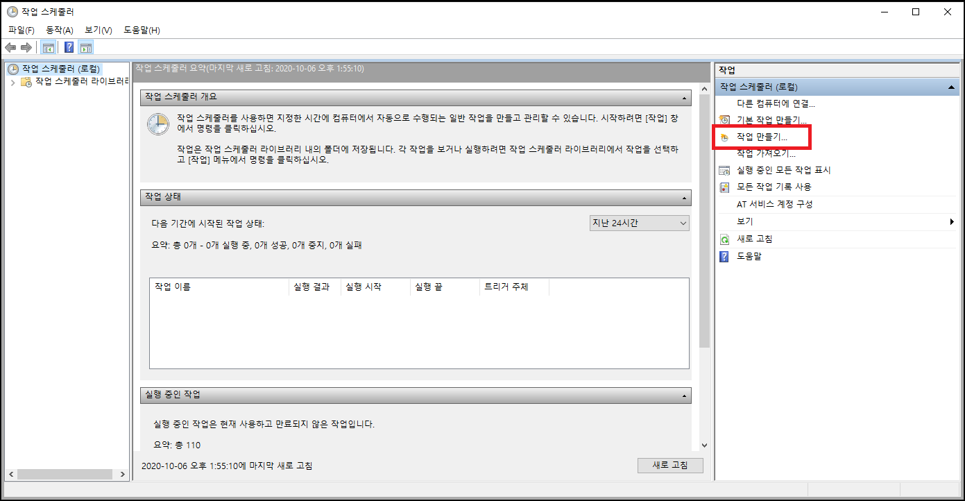 - 작업 스케줄러 창에서 우측 작업 메뉴에서 작업 만들기...을 클릭 합니다