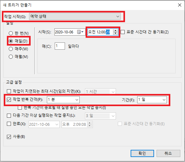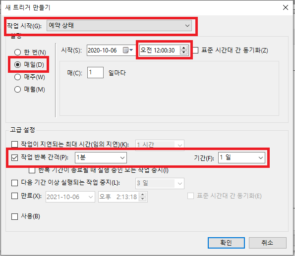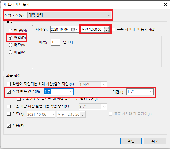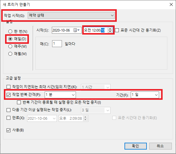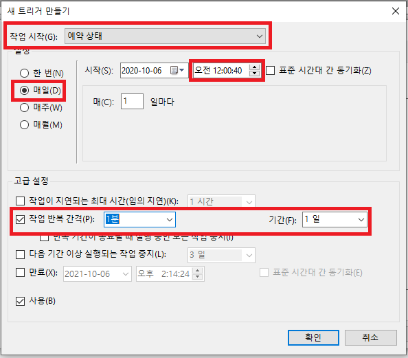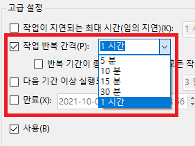 작업스케줄러에 반복 작업을 등록하고자 할때 선택 할 수 있는 시간이