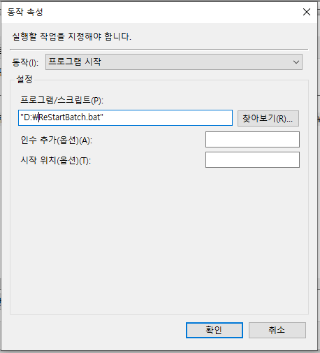 (저는 Bat파일을 만들어서 해당 Bat파일을 동작하게 하는 동작 속성을 설정하였습니다)