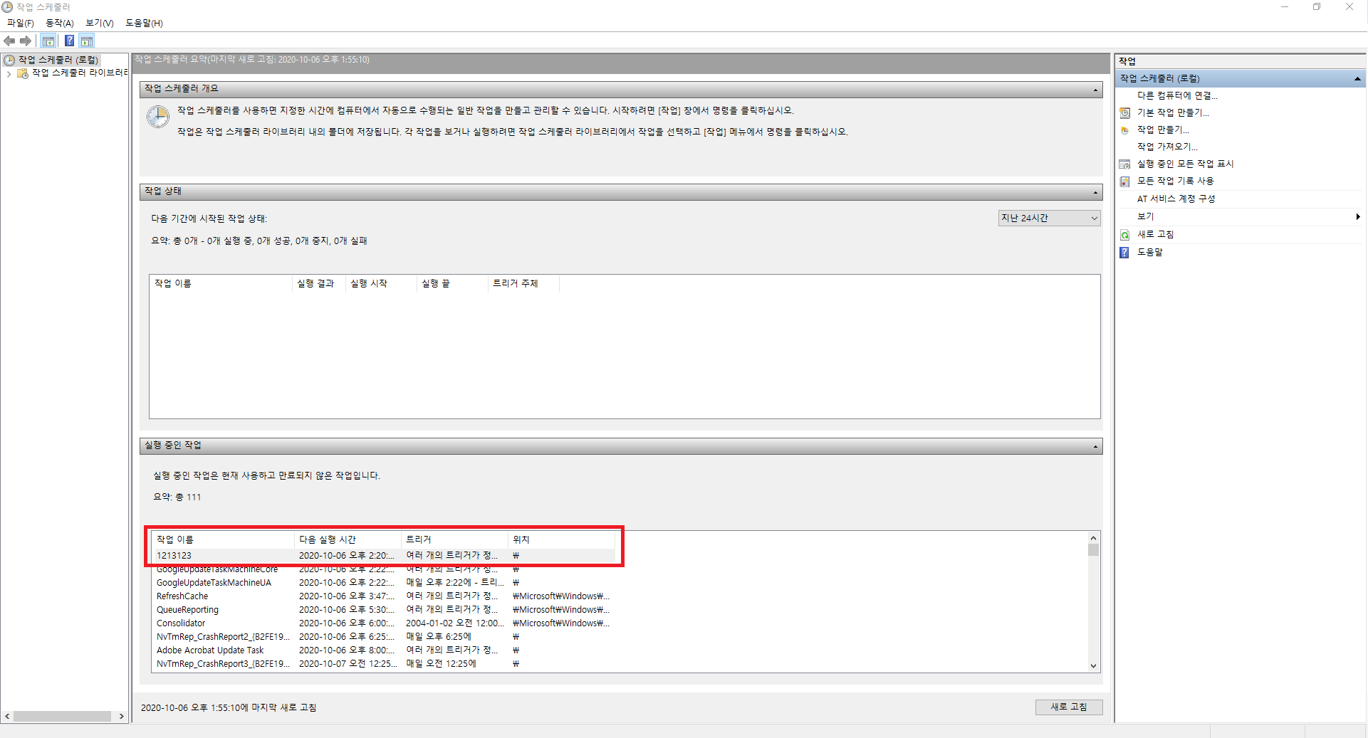 - 위의 과정을 모두 이행하셨다면 작업 스케줄러 화면에서 아래에 "실행 중인 작업"에서