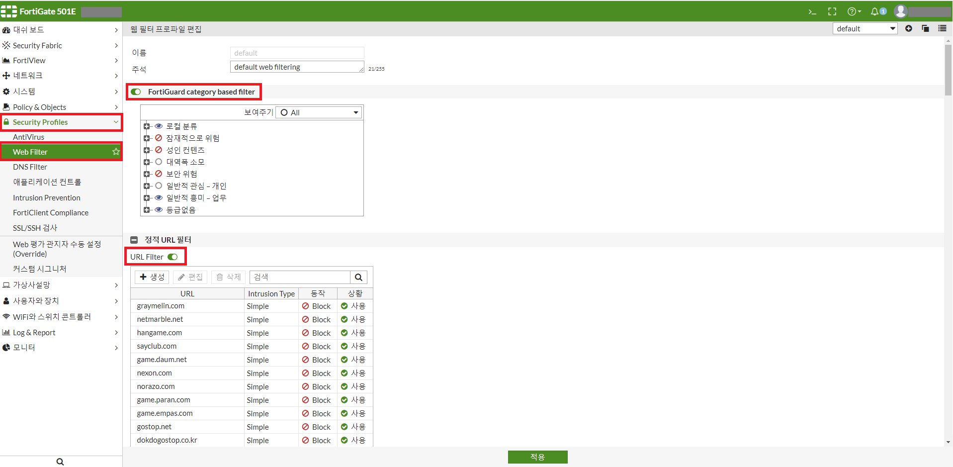 이번 포스팅은 포티게이트(FortiGate) 방화벽 장비 기능 중 웹필터 정책을 사용해서