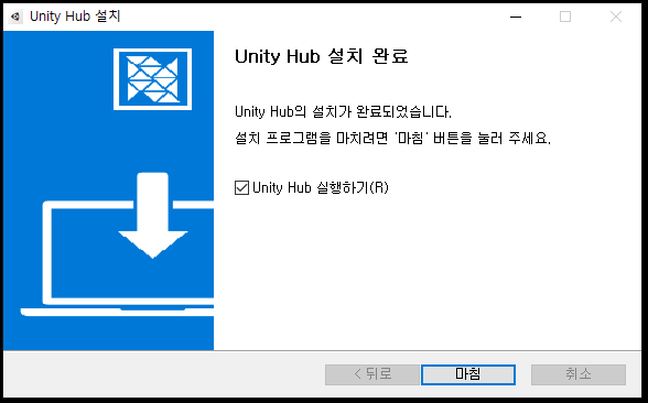 마침버튼을 눌러 유니티 허브(Unity Hub)를 한번 실행해 보죠
