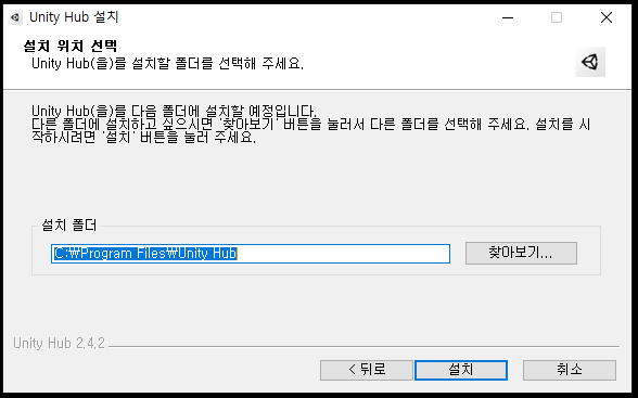 그럼 유니티 허브(Unity Hub)가 설치가 됩니다