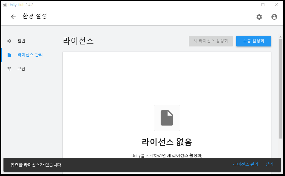 이렇게 유니티 허브(Unity Hub)가 실행되는것을 확인하실수있습니다