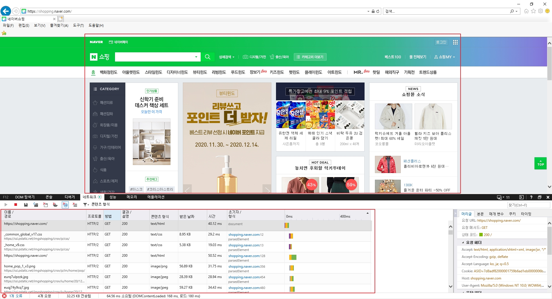여기서 네이버 쇼핑을 눌렀을때 어는 URL 또는 어는 단계에서 차단이 걸리는지 확인 할 수 있습니다