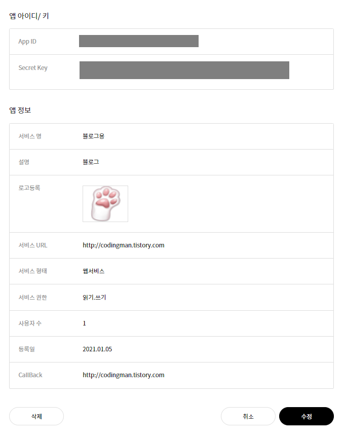 앱 관리 -> 등록된 서비스명의 설정을 클릭