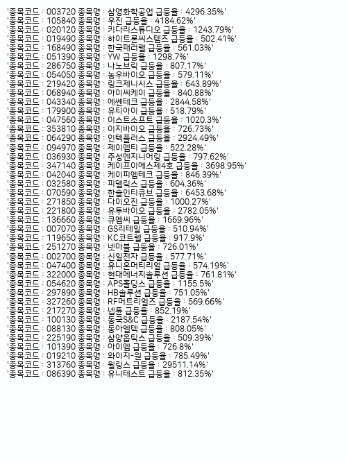 (현재 기준 지난 30일간 주가가 10배 이상 급등한 주가 리스트입니다)