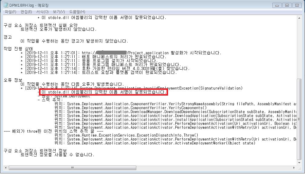 VS2010으로 작업했던 작업의 업데이트를 위해서 배포를 했더니 (ClickOnce) 다운로드 완료후 실행시 자꾸 " stdole.dll 어셈블리의 강력한 이름 서명이 잘못되었습니다." 라는 메세지로 업데이트가 안되는 현상이..