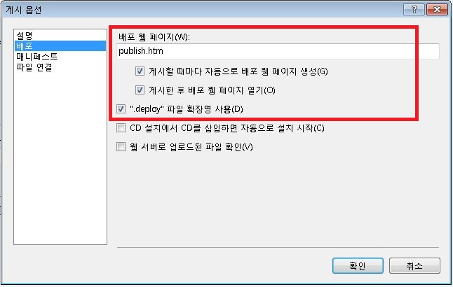 - IIS서버 상세 속성 설정에서 기본문서부분에 publish.htm 항목 추가
