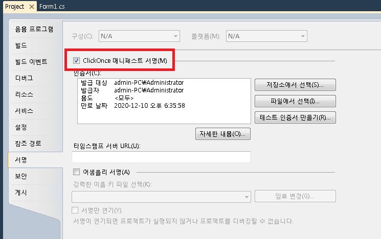 18. 프로젝트 속성에서 보안탭에서 ClickOnce 보안 설정 사용 체크 설정