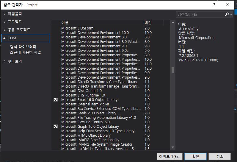 참조 관리자에서 COM탭에서 형식 라이브러리 항목중에 다음 리스트들을 참조 추가 해줍니다