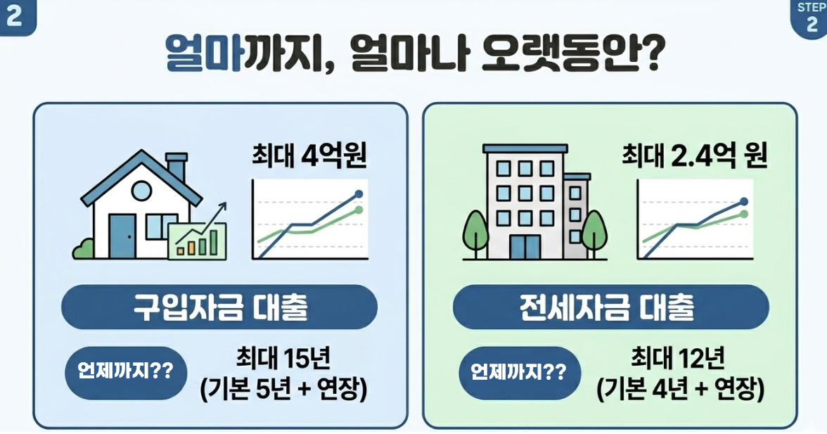 소득 기준이 완화되어 대기업 맞벌이 부부도 충분히 혜택을 볼 수 있습니다. 대출 한도 역시 구입자금 최대 5억 원, 전세자금 최대 3억 원으로 실질적인 주택 구매력을 보장해 줍니다.