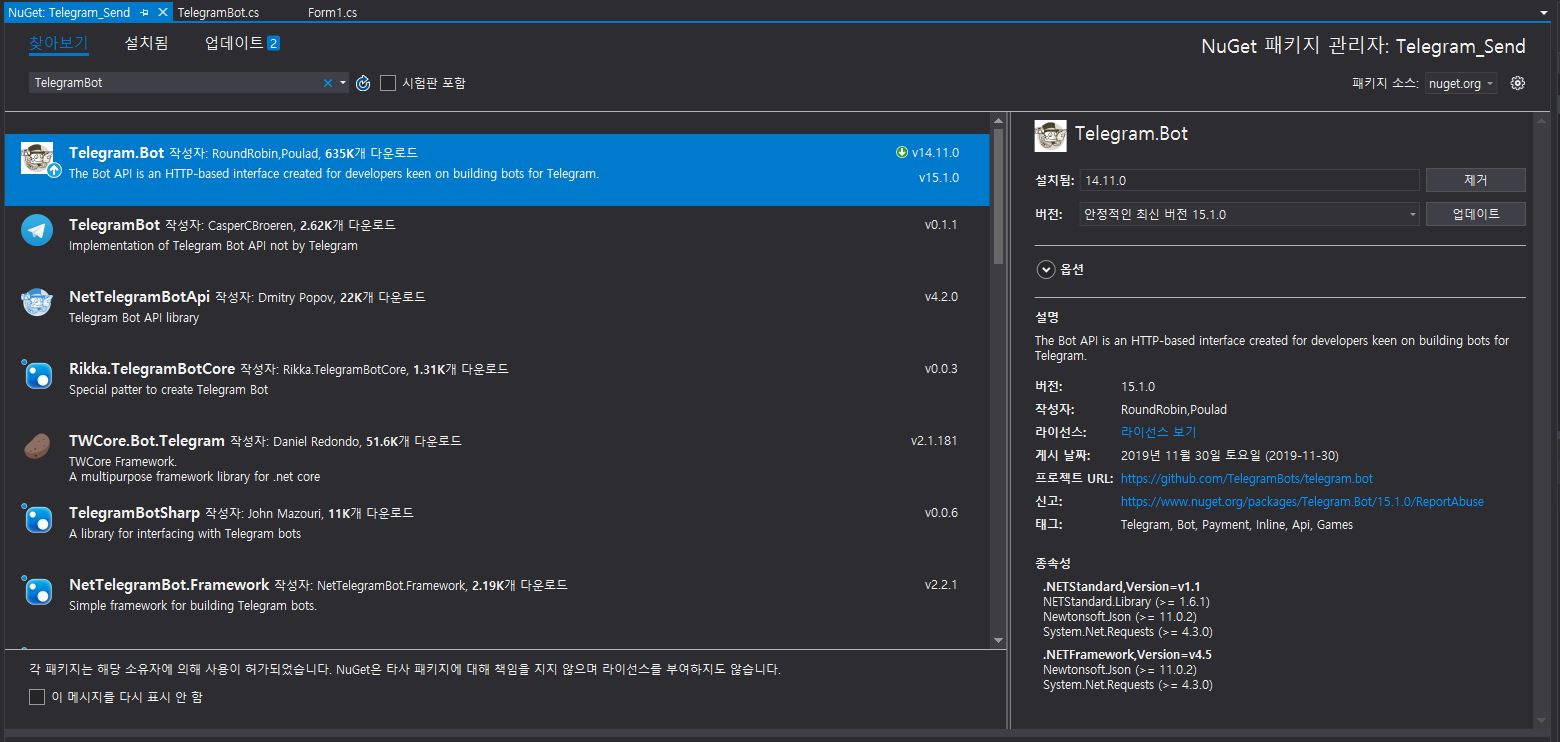 그 다음 Nuget을 통해 TelegramBot을 참조 추가 해줍니다