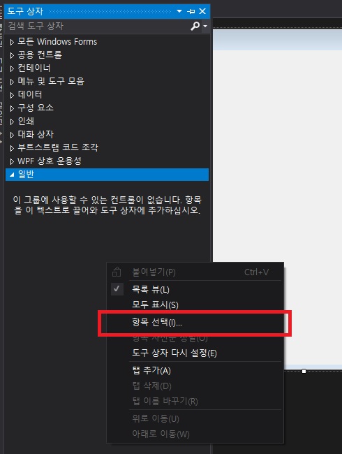 - 도구상자에서 빈공간에서 마우스 오른쪽 버튼을 클릭하여 "항목선택"을 클릭