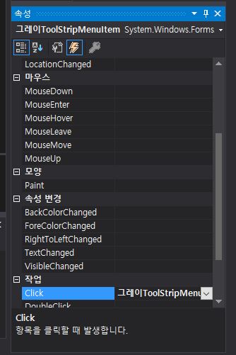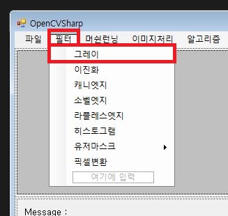 미리 만들어 놓은 MenuStepmenuStrip에 필터 -> 그레이라는 메뉴를 등록합니다