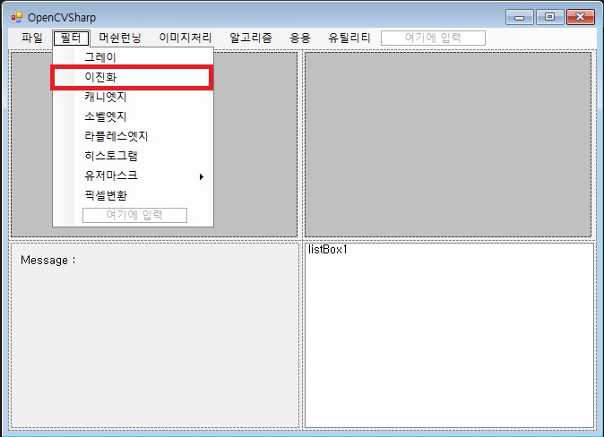 - Menu에 다음과 같이 필터 -> 이진화 메뉴를 등록해 줍니다