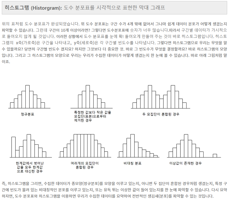 『도수 분포표의 하나. 가로축에 계급을, 세로축에 도수를 취하고, 도수 분포의 상태를 직사각형의 기둥 모양으로 나타낸 그래프. 주상 도표(柱狀圖表).』