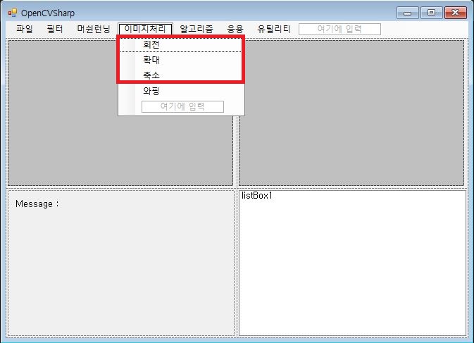 - 다음과 같이 Menu에 이미지처리 -> 회전, 확대, 축소 버튼을 만들어 주세요