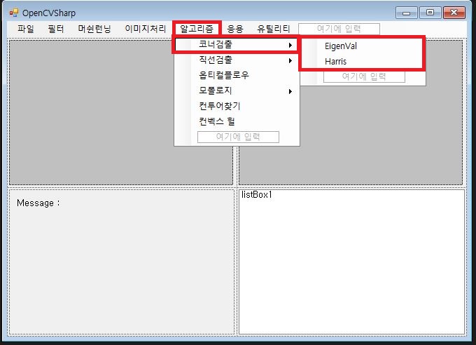 - 최상단에 알고리즘 -> 코너검출 -> EigenVal / Harris