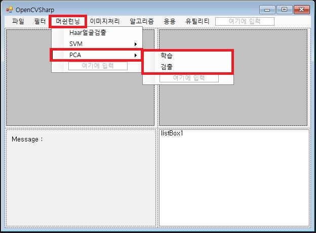 - 메뉴에 머쉰런닝 탭에 PCA 버튼을 만들고 학습과 검출의 세부 버튼을 생성합니다
