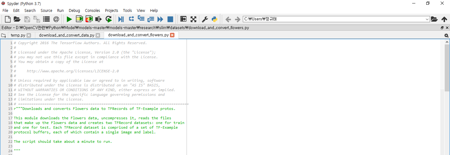 (저는 Anaconda3에 포함되어 있는 spyder를 이용해서 열었습니다)