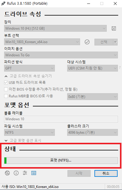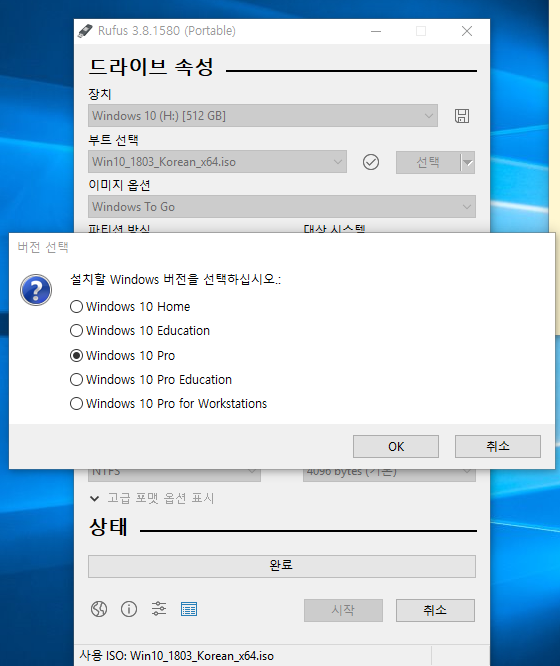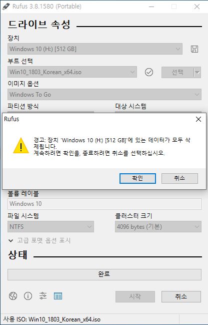 * 제가 사용하는 하드디스크는 이미 한번 rufus를 사용한 하드 디스크라 다음과 같은 화면이 하나 더 나오는데