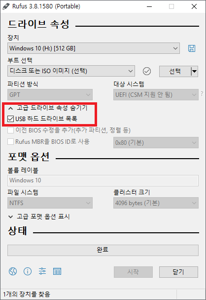 - 고급 드라이브 속성 숨기기를 활성화한 뒤 USB 하드 드라이브 목록을 체그 해 줍니다