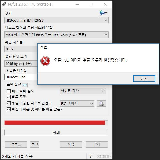 두번째 오류는 : "오류 : ISO 이미지 추출 오류가 발생했습니다."