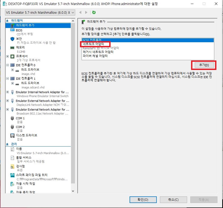 7. 설정 화면에서 하드웨어 추가 항목중 네트워크 어댑터를 클릭 후 추가 버튼을 눌러 어댑터를 추가 합니다
