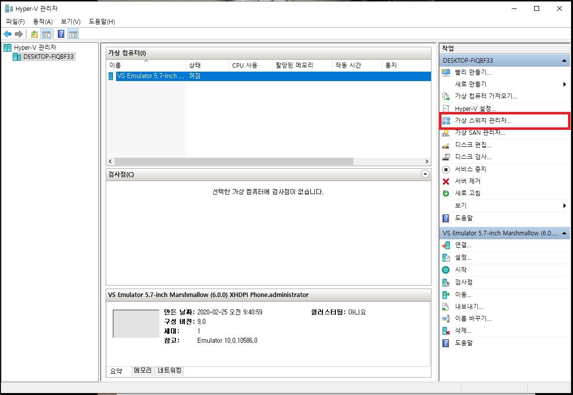 6. 다시 Hyper-V 관리자에서 가상 컴퓨터에서 사용중인 에뮬레이터를 선택한 후 마우스 오른쪽 버튼을 클릭하면