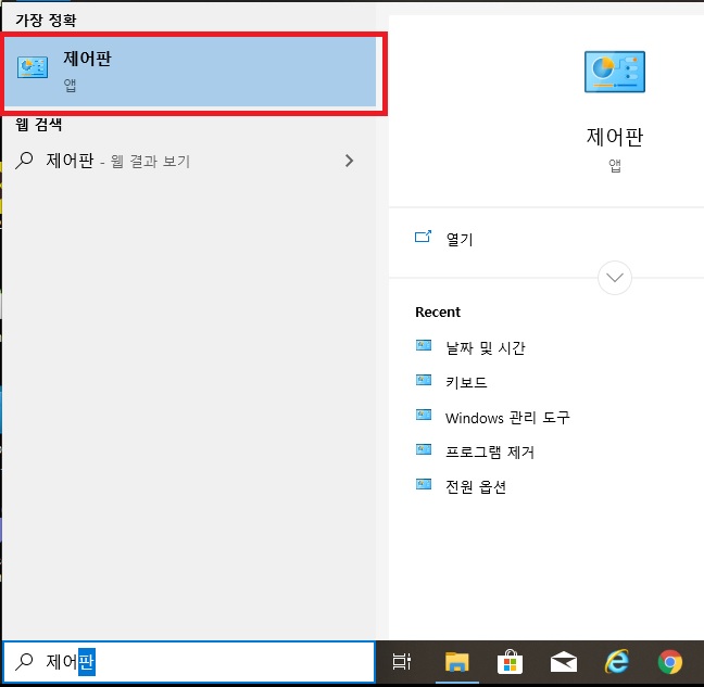 - 윈도우10에서 검색을 통해 제어판을 열어 줍니다