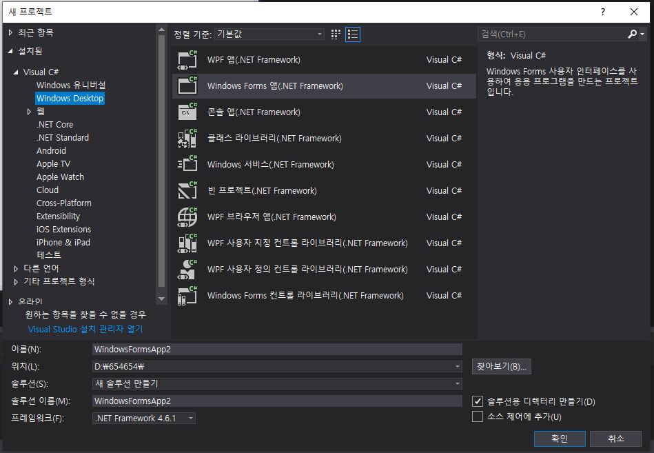 비쥬얼 스튜디오 2017(제가 사용한 버전입니다)를 실행해서 윈폼 형식의 프로젝트를 생성합니다
