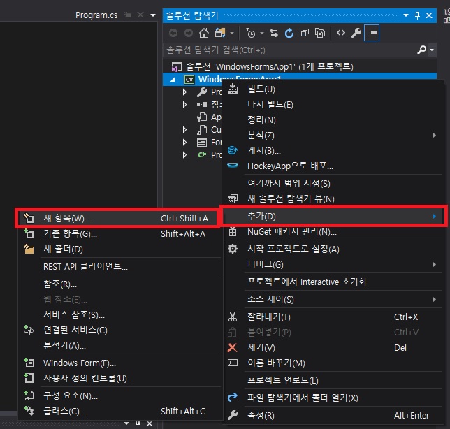 3. 프로젝트가 생성된 위치에 컨트롤로 사용할 윈폼 형식의 폼을 하나 추가해 줍니다
