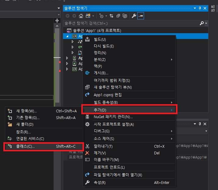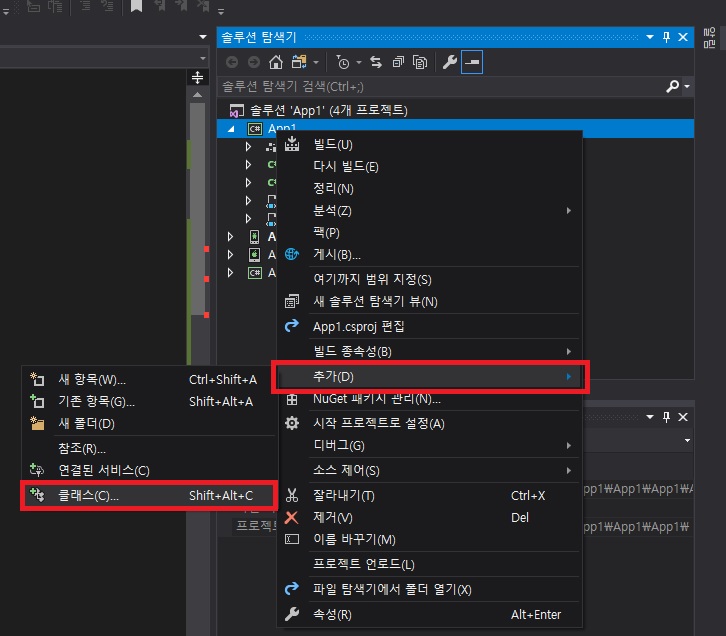 - 다시 C# 프로젝트에서 마우스 오른쪽 버튼을 클릭하여 클래스 파일을 추가 합니다