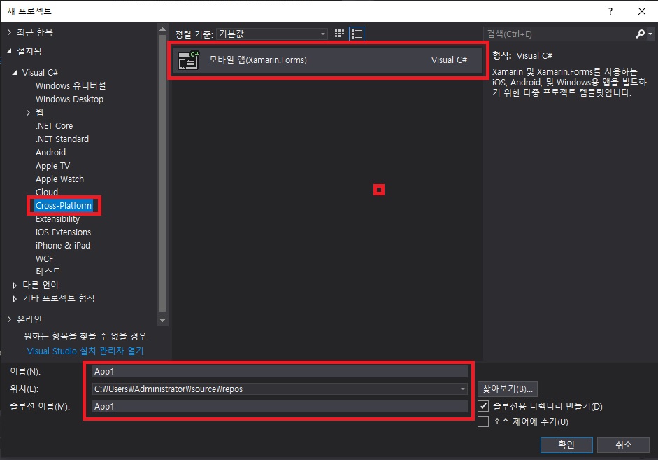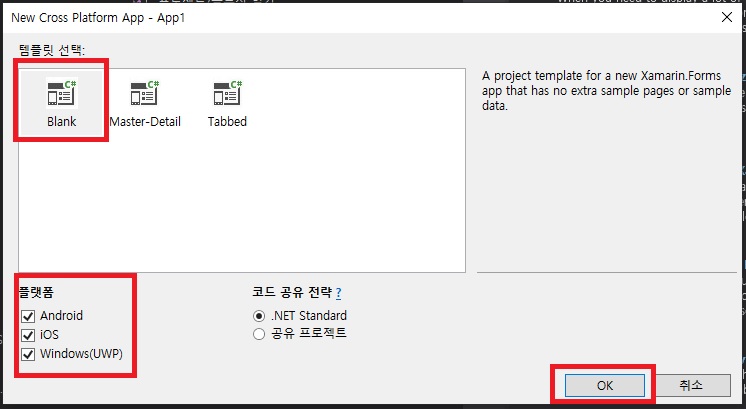 - 프로젝트 형식은 Cross-Platform 형식이며, 모바일 앱(Xamarin.Forms) 형식의 폼을 구성해서 만듭니다