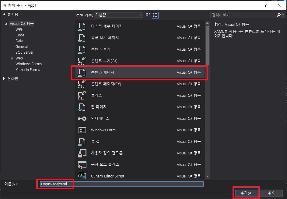 - 이번에는 LoginPage.xaml 이름을 가진 콘텐츠 페이지를 추가합니다
