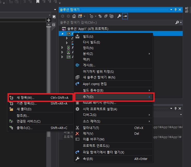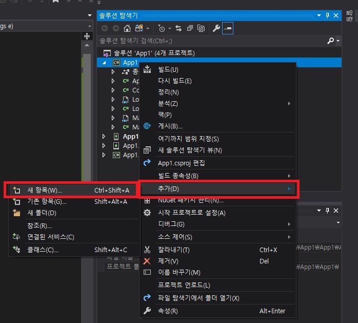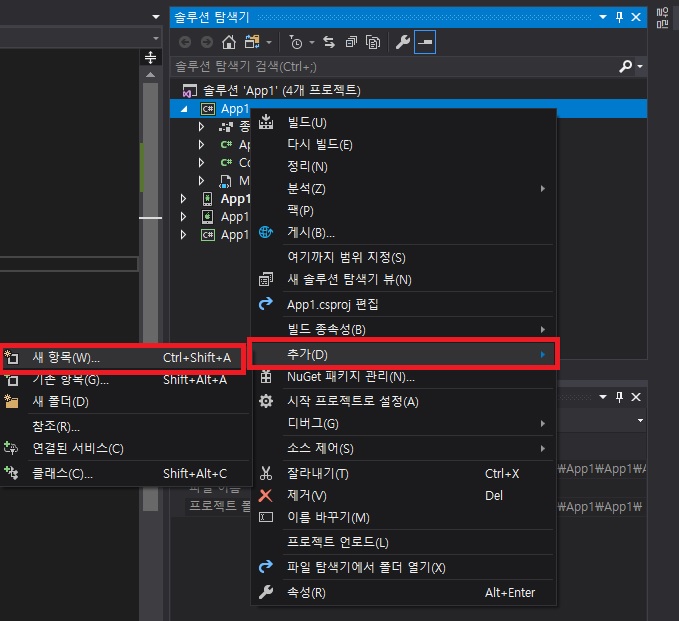 - C# 프로젝트에서 마우스 오른쪽 버튼을 통해 새항목을 선택합니다