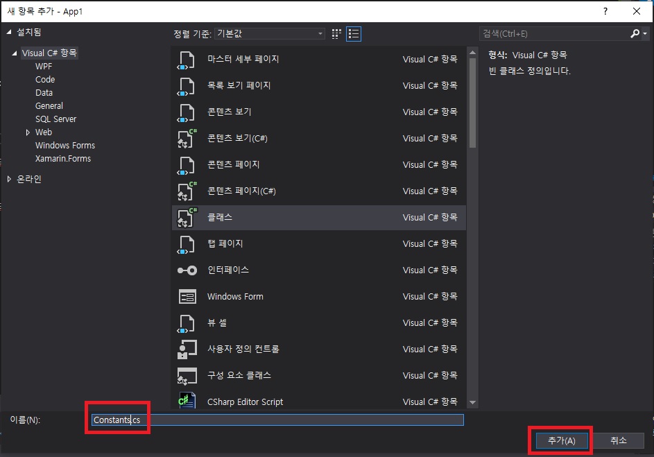 - 클래스 명은 Constants.cs로 만들고 추가 합니다